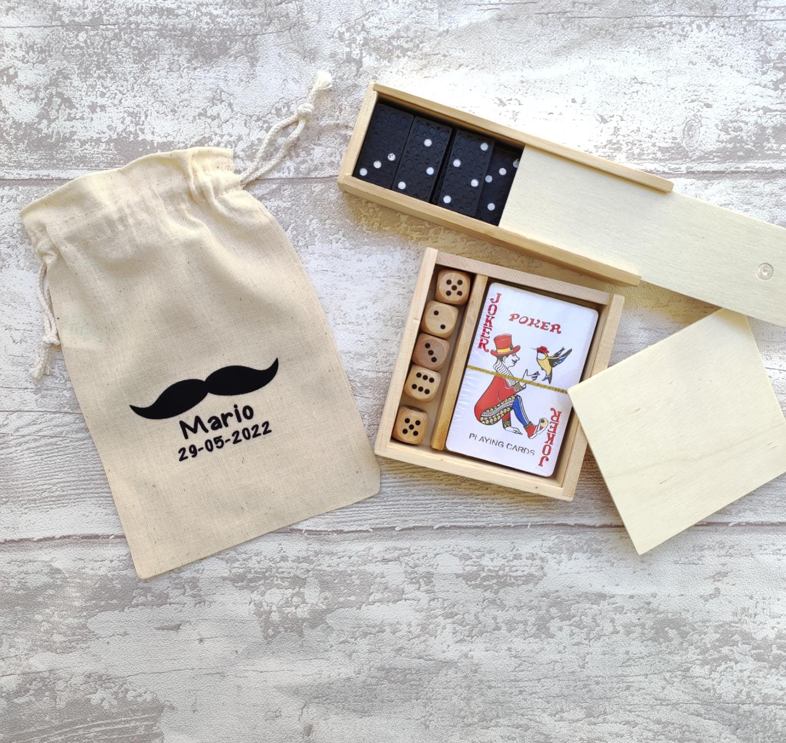 Un surtido de juegos para momentos de entretenimiento. Incluidos: Baraja de cartas, Dados de Poker y Dominó.