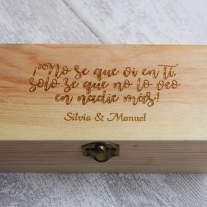 Sí. Al hacer el pedido indícanos la frase que deseas ponerle a la caja. También puedes añadir Nombres y Fecha.